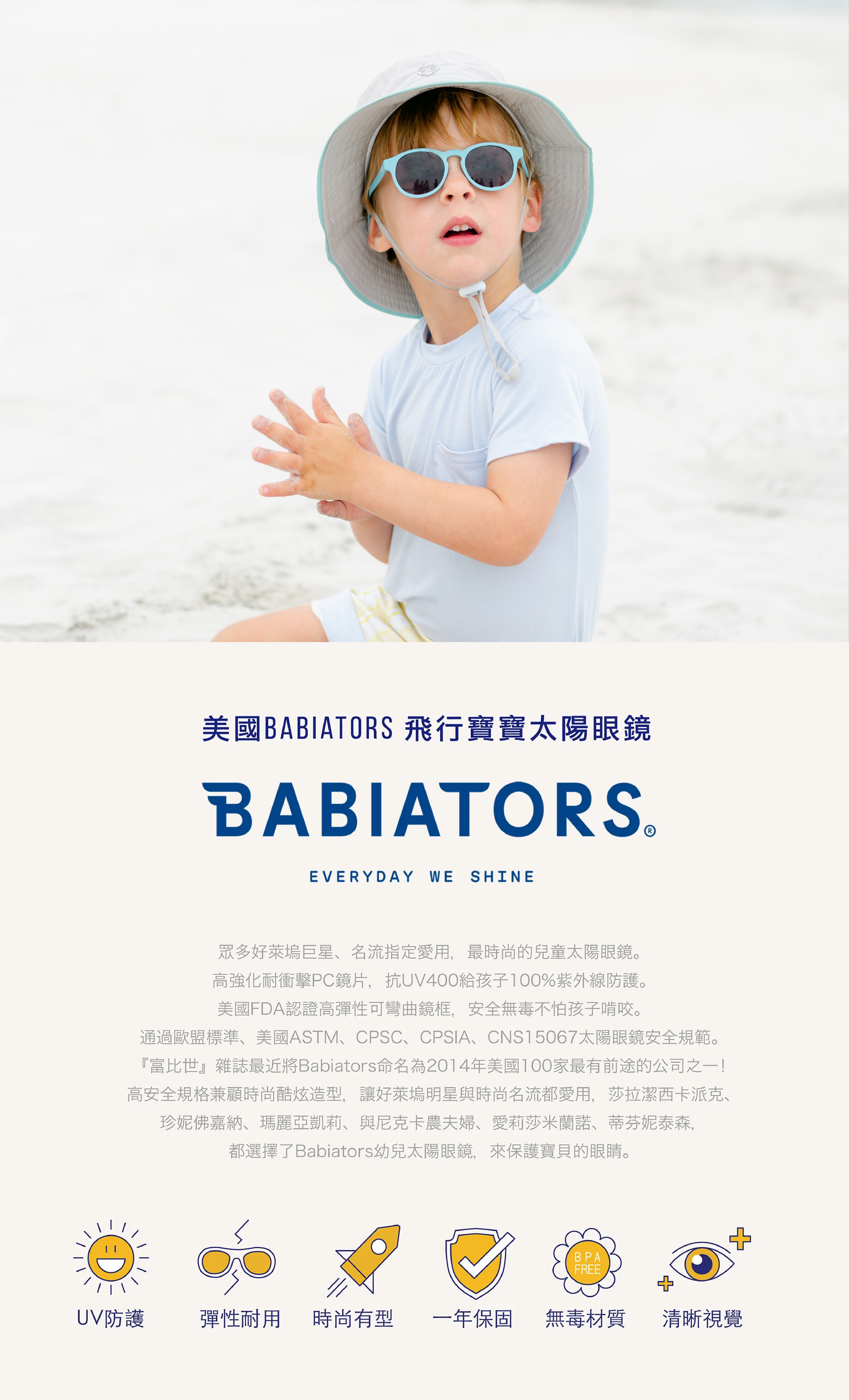 Babiators是由一位駕駛戰鬥機飛行員TED在一次飛行任務時,俯視地面上的孩子們,他發現孩子們只能瞇著眼好奇的仰望天空,孩子的眼睛更需要加倍呵護,於是他與妻子共同設計研發幼童專用太陽眼鏡。 “富比世”雜誌最近將Babiators命名為2014年美國100家最有前途的公司之一!高安全規格與實用性兼顧酷炫造型設計,讓好萊塢明星與時尚名流都愛用❤️