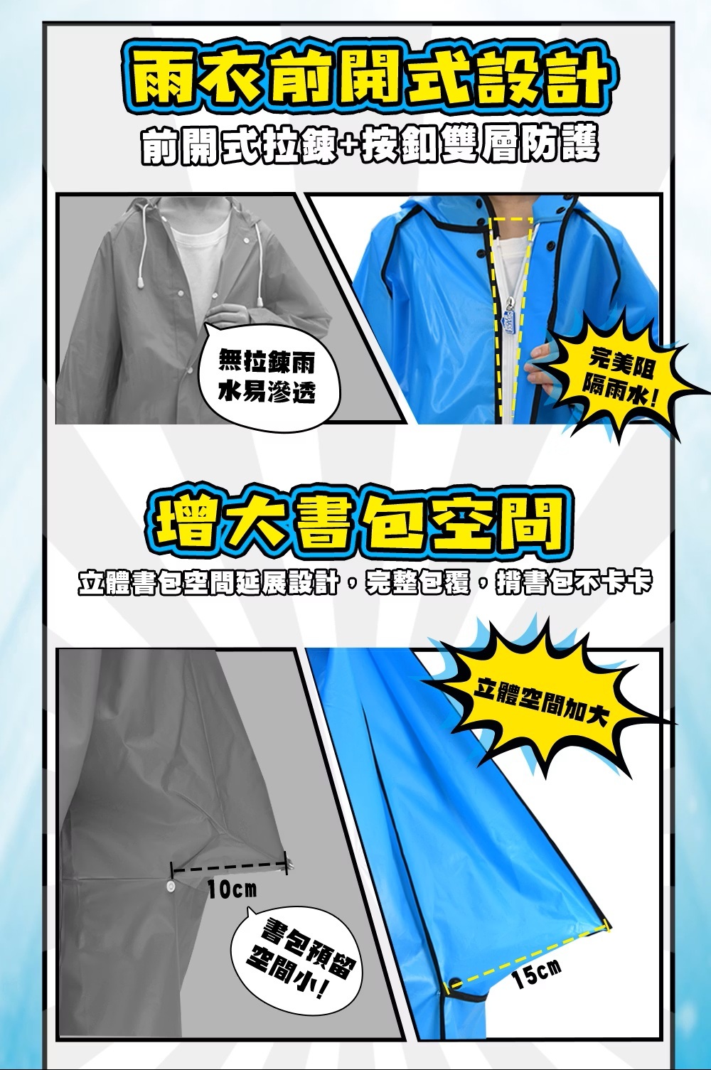 .前開式加長版型,拉鍊+暗釦雙層防護,完美阻隔雨水