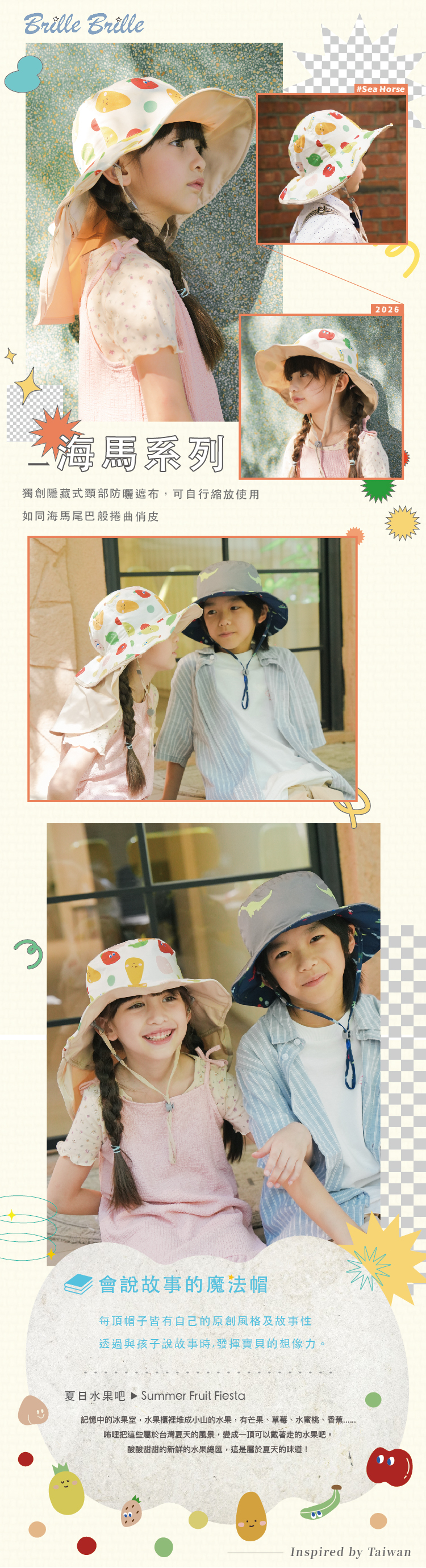 台灣BrilleBrille UPF50+物理防曬鬆緊版尾巴可收放型防曬帽 - 夏日水果吧 (禮盒包裝)